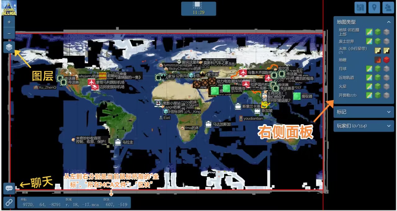 - 右侧世界选择:右侧面板可以让你选择其他世界,如 末地、地幔、月球 ······并切换不同的视图方式: