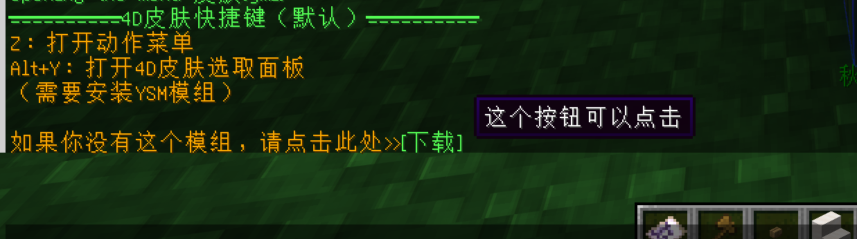 - 功能:使用 YSM 模组来更改你的 3D 皮肤模型。YSM 皮肤通常拥有更多样的形式和动作,你可以变成狮、虎、豹等动物,也可以变成卡车、坦克等车辆,只要有3D模型,没有你做不到的。